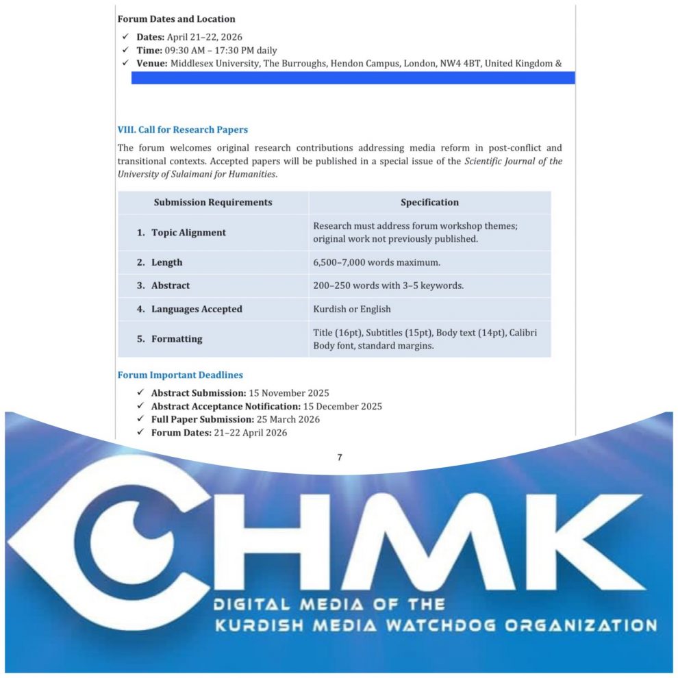 CHMK, Kurdistan Region of Iraq: The Higher Committee of the Third CHMK National Forum for Media Reform has officially announced the participatory format for the upcoming international scientific conference titled “Media Reform in Post-Conflict Areas: An International Scientific Conference on Kurdistan’s Strategic Policy Roadmap.” The forum is scheduled to take place on 21–22 April 2026 at Middlesex University, London.